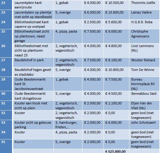 65 natuurlijke en rechtspersonen hadden zich ingeschreven voor de online bieding. Per natuurlijke en rechtspersoon konden maximaal twee locaties worden toegewezen. Uiteindelijk werd er geboden op 32 locaties, goed voor een jaarlijkse inkomst van 625.800 euro. Op drie locaties op de Kouter werd er geen bod gedaan. De prijzen voor een locatie varieerden van 2.100 tot zelfs 61.000 euro.