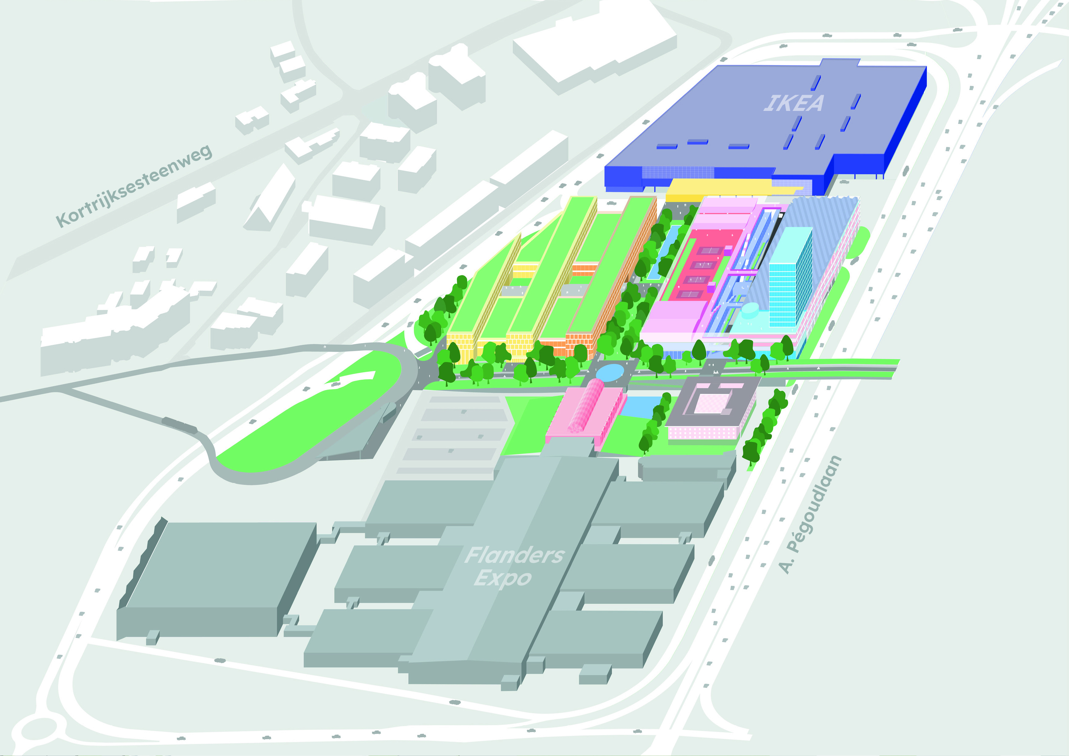 Het plan voorziet twee bouwzones met daartussen een centrale, brede esplanade die Ikea en Flanders Expo verbindt. Dwars op deze esplanade komt een groene boulevard, de hoofdverbinding voor fietsers en voetgangers tussen de oost- en westzijde van The Loop, over de Pégoudlaan heen. De boulevard sluit ook aan op de tramhalte.