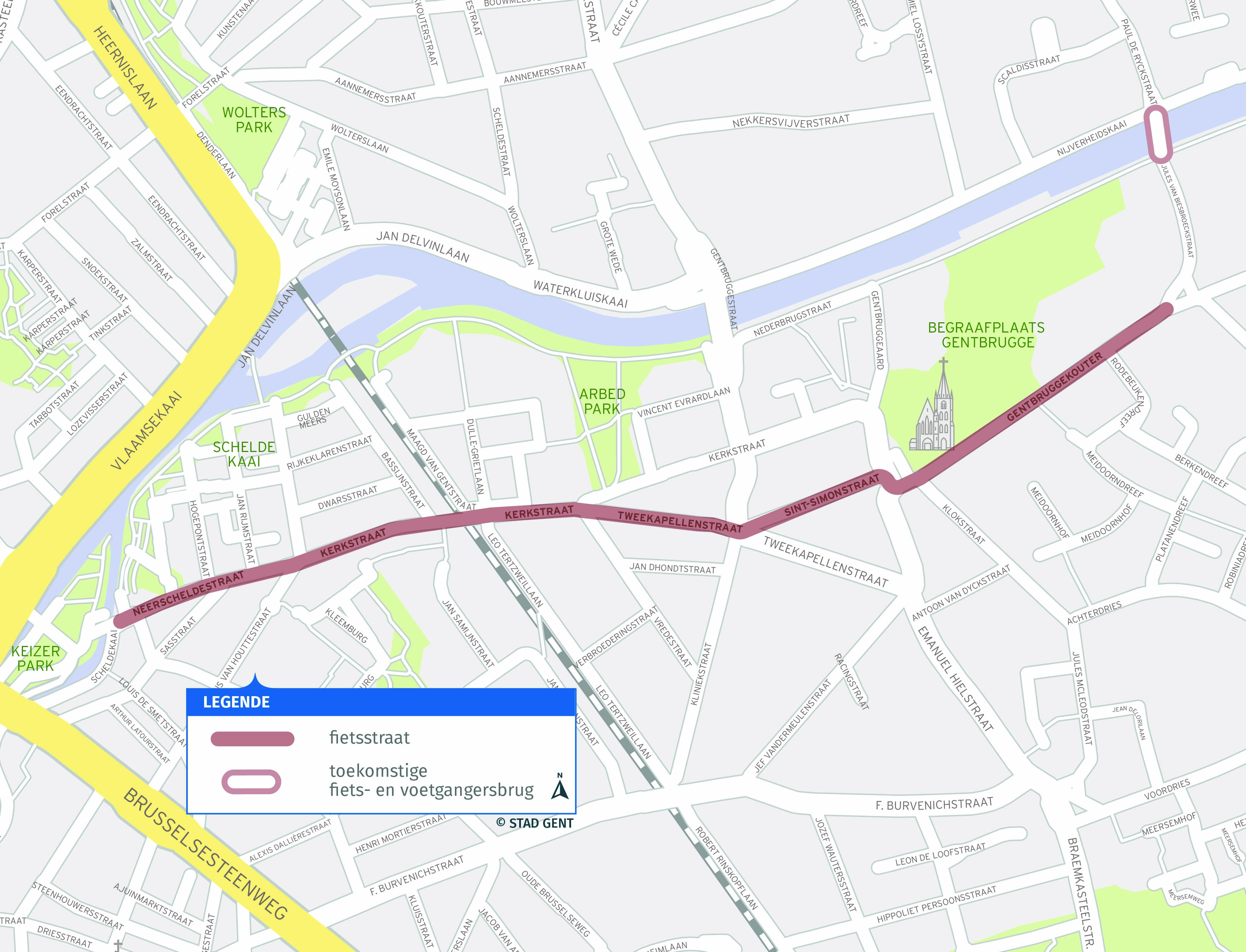 De nieuwe fietsstraat wordt dit najaar ingericht en loopt van het Keizerpark langs de Neerscheldestraat, Kerkstraat, Tweekapellenstraat, Sint-Simonstraat, Gentbruggeplein en Gentbruggekouter tot aan de Lieve Kleine Piranhabrug, de toekomstige fiets- en voetgangersbrug over de Schelde. In een fietsstraat mogen auto’s fietsers niet inhalen.