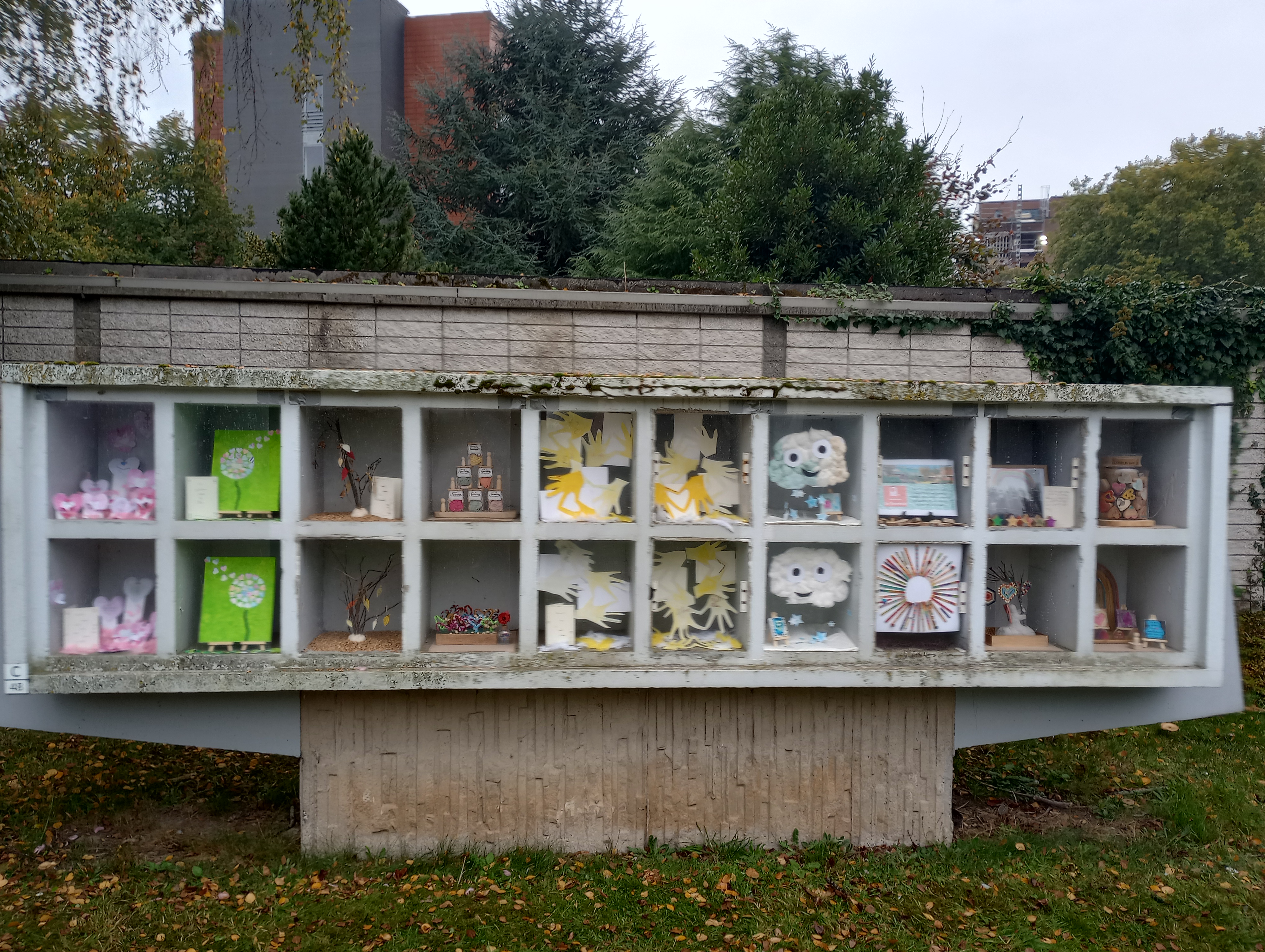 Buurtbewoonster Veronique Van de Woestyne nam zelf het initiatief en toverde de nissen samen met de buurt, scholen en kunstenaars helemaal om tot een plek vol kunstwerken. Van werkjes in crêpepapier tot beeldjes in klei, een speciale invulling in het kader van Reveil.