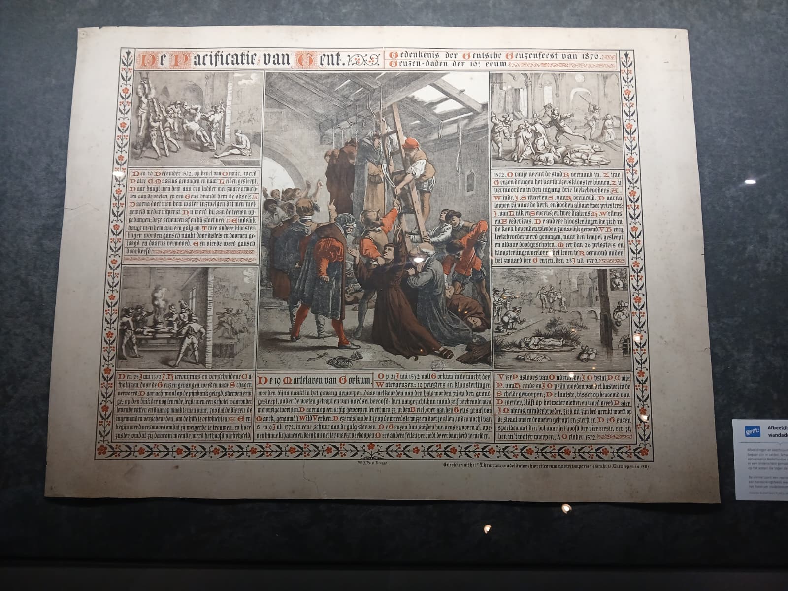 De Stad Gent zet die gebeurtenis een heel jaar lang in de kijker in samenwerking met tal van culturele en academische partners uit België en Nederland. Als startschot werden vandaag enkele archiefstukken voorgesteld in de vitrines in het stadhuis, waaronder een gedrukt exemplaar van de Pacificatie van Gent en een reproductie van een 19de-eeuwse afbeelding van 'de wandaden die in 1572 door geuzen zijn begaan'. Doorheen het jaar komen er nieuwe stukken in de vitrines.