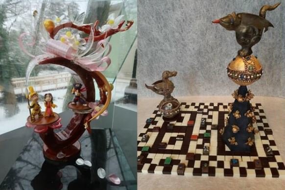Links de chocaladecreatie van Nicolas Vanaise van Yuzu uit Gent en rechts die van de Association Confiserie Ishikawa uit Kanazawa.