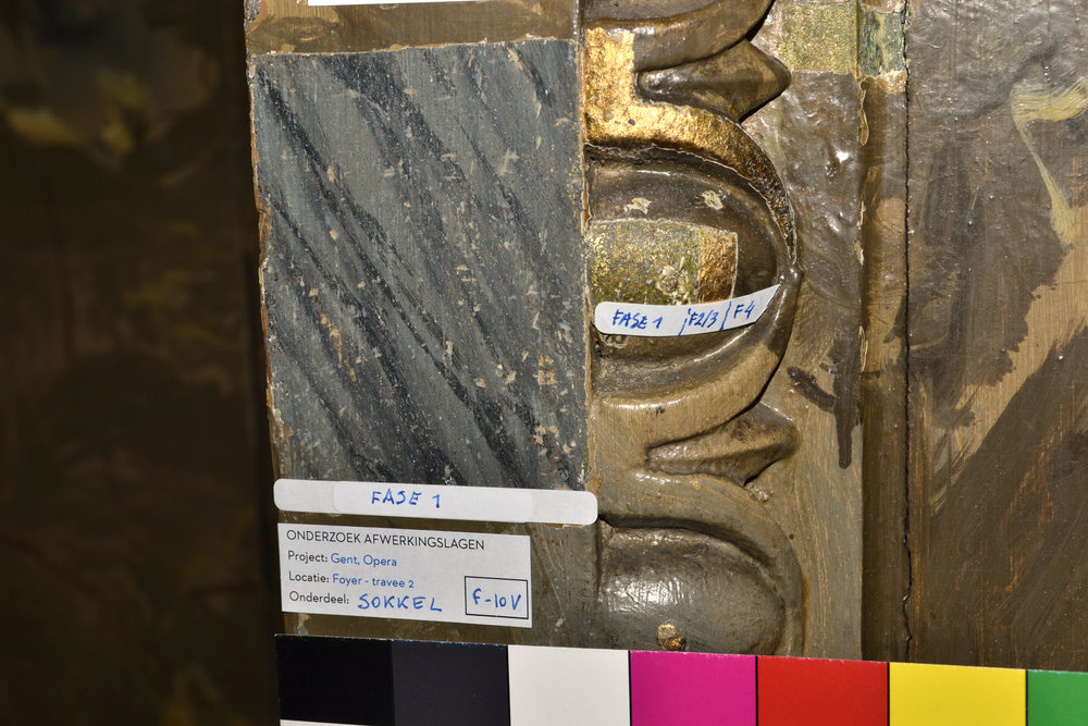 Een marmerimitatie-schildering op een sokkel in de Foyer.