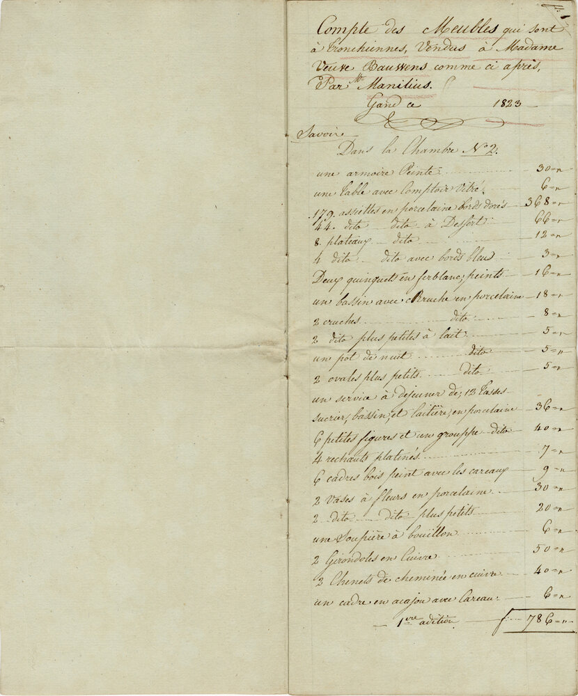 Inventaris van de woning Bauwens in Drongen: na de dood van Lieven Bauwens in 1822 werden de woning en de inboedel verkocht.